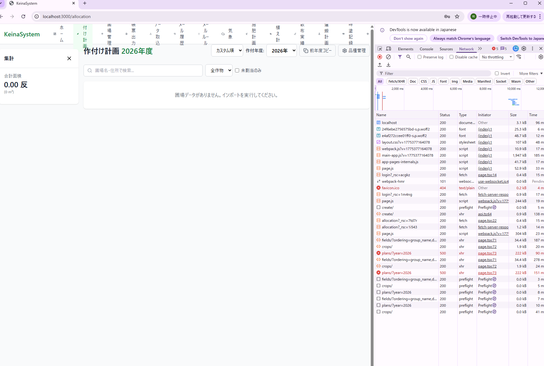 http://localhost:3000/allocationで以下を確認しました。fields/?ordering=group_name,display_order,id→200crops/→200plans/?year=2026→500つまり、作付け計画一覧 API 自体が失敗しています。